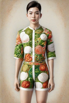 The image is an artistic representation of a male figure wearing a unique outfit. The outfit is a shirt and shorts that are designed to resemble a variety of the  Vietnamese white noodles, vegetables, meat, and sauces, arranged in a pattern that covers the entire garment. The figure is standing against a plain background with a textured appearance. Notable features include the detailed depiction of the food items on the clothing and the signature of the artist at the bottom right corner. The overall impression is one of creativity and fashion, blending the concept of clothing with culinary art.,Enhanced Realistic,Pho