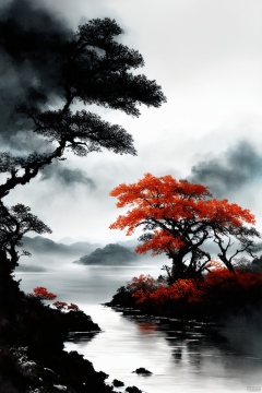 Ink painting, ancient Chinese painting, traditional Chinese ink painting, landscapes, lakes, trees, shrubs, black, red, gray, orange, light blue, light blue, white smoke (monochrome, Romantic era painting, black ink stains Maurice Sapiro、zdzislaw Beksinski,:0.6)、 Ultra detailed, detailed background, masterpiece, fine detail, complex background, 8K resolution, tree branches, ink painting,