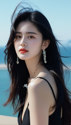 hyper realistic photo of a beautiful girl,20yo,detailed exquisite face,soft shiny skin,Chinese girl,long and natural black hair styled impeccably reflecting modern urban trends,Kristen Stewart lookalike,perfect female form,model body,elegant urban fashion,earrings and necklaces,, Standing at beautiful Nice beach in Paris,sea shore,bird,ocean, [cobalt blue,yellow and cream colors],, dark:1.3,chiaroscuro lighting:1.2, ek_ph0t0_b00ster