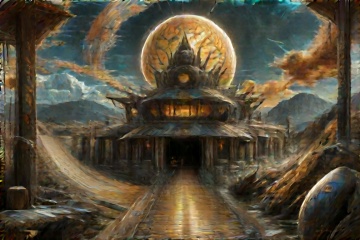 A surreal, futuristic landscape at dusk with a massive, luminous golden moon dominating the sky, casting a warm glow over everything. The moon should be sharp, detailed, and prominent in the foreground. The background should transition into an abstract, painterly environment featuring indistinct forms and shapes suggesting a Tibetan monastery, rendered in a loose, impressionistic style to emphasize mood and atmosphere over detailed realism. The atmosphere should be hazy and diffuse, with the haze or fog being whiter, creating an ethereal and somewhat dystopian feel. Use balanced colors primarily from a palette of grays, blues, and greens to create depth and atmosphere, while incorporating rust-orange, rust-red, rust-brown, rust-yellow, rust-gold, rust-gray, rust-beige, rust-copper, rust-tan, burnt sienna, raw umber, burnt umber, and yellow ochre for accents. These earthy tones should depict worn, weathered, and aged appearances. Incorporate small, distinct accents of rusty orange-yellows and rusty teals to highlight specific areas and enhance visual interest. Ensure the painting blends impressionism and abstraction seamlessly, creating a rich, immersive setting. Utilize Unreal Engine, Octane Render, Hyper Realistic, Cinematic, Epic, and Matte Painting techniques to achieve a high-quality, detailed, and visually striking result."