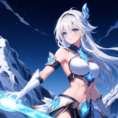 Anime of a beautiful girl standing. She uses the magic ring and turns into a beautiful ice magic \(ek_ges1ba\) warrior \(detailed exquisite face\), long hair,breasts,blue eyes,gloves,navel,medium breasts,very long hair,white hair,parted lips,white gloves,fingerless gloves,armor,lips,bodysuit,shoulder armor,ek_game_3ffect, Dark:1.2,at night, At a hill top,mountains