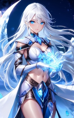 a beautiful girl standing. She uses the magic ring and turns into a beautiful ice magic \(ek_ges1ba\) warrior \(detailed exquisite face\), long hair,breasts,blue eyes,gloves,navel,medium breasts,very long hair,white hair,parted lips,white gloves,fingerless gloves,armor,lips,bodysuit,shoulder armor,ek_game_3ffect, by the style of Makoto Shinkai's artwork,, Dark night,dark:1.2,moon