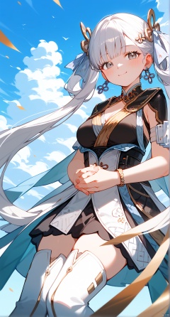 (score_9,score_8_up,score_7_up),1girl,solo,(masterpiece:1.3),( beautiful:1.2),(high quality:1.2),(finely detailed:1.2),extremely detailed cg unity 8k wallpaper,best quality,a very delicate and beautiful,perfect fingers,(one cute girl at the center:1.2),1girl, solo, long hair, breasts, looking at viewer, blush, smile, bangs, hair ornament, thighhighs, dress, twintails, jewelry, medium breasts, closed mouth, white hair, earrings, boots, sky, day, cloud, bracelet, white thighhighs, blue sky, grey eyes, thigh boots, own hands together,jinhsi