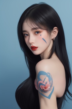 1girl, arm tattoo, bangs, bare shoulders, blue background, blue eyes, blue hair, body writing, breasts, facepaint, facial mark, facial tattoo, gradient, gradient background, hair ornament, heart tattoo, lips, lipstick, long hair, makeup, medium breasts, number tattoo, parted lips, red lips, shoulder tattoo, sleeveless, solo, tattoo, upper body <lora:绘画美女1.0:0.8>