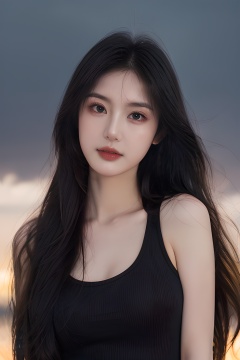 1girl,(simple background:1.2), <lora:0804_08:0.7>,<lora:SDXLrender_v2.0:0.6>, (medium breasts:0.8), Frontal photography,Look front,evening,dark clouds,the setting sun,On the city rooftop,A 20 year old female,Black top,Black Leggings,black hair,long hair, dark theme, muted tones, pastel colors, high contrast, (natural skin texture, A dim light, high clarity) ((sky background))((Facial highlights)),