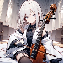line art,line style,indoors,church,1girl,solo,small breasts,collared jacket,white jacket,wing collar,black ascot,black gloves,wide sleeves,short over long sleeves,dress shirt,sgrey shirt,lace-trim,black thighhighs,garter straps,seductive smile,half-closed eyes,looking at viewer,pov,close-up,cello,playing cello,masterpiece,bestquality,onnk,Q,