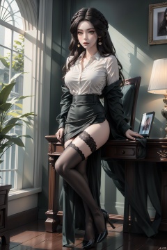 masterpiece, ultra-clear picture quality, real effect, 8k ultra-clear, fine picture effect, ((poakl)),1girl, solo, long hair, breasts, looking at viewer, skirt, shirt, thighhighs, long sleeves, jewelry, medium breasts, closed mouth, standing, full body, white shirt, purple hair, earrings, collared shirt, black thighhighs, indoors, miniskirt, black skirt, nail polish, black footwear, high heels, lips, zettai ryouiki, window, dress shirt, makeup, chair, table, crossed legs, plant, desk, pencil skirt, red lips, potted plant, office lady, computer, monitor, laptop, office