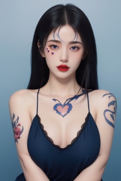 1girl, arm tattoo, bangs, bare shoulders, blue background, blue eyes, blue hair, body writing, breasts, facepaint, facial mark, facial tattoo, gradient, gradient background, hair ornament, heart tattoo, lips, lipstick, long hair, makeup, medium breasts, number tattoo, parted lips, red lips, shoulder tattoo, sleeveless, solo, tattoo, upper body ,huge breast<lora:绘画美女1.0:0.8>