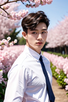 masterpiece, 1 Boy, 22 years old, Korean Men's Hair, Look at me, Brown eyes, Short hair, White shirt, Tie, Outdoor, Garden, Cherry blossom, Flying petals, textured skin, super detail, best quality