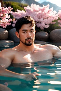 realistic,masterpiece,best quality,cinematic,dynamic lighting,soft shadow,highest detail,professional photography,detailed background,depth of field,insane details,intricate,aesthetic,detailed face,subsurface scattering,realistic hair,realistic eyes,1boy,muscular,manly,(large pectorals:1),pectorals,abs,Portrait photo of a handsome japanese man sitting in a hot spring,submerged in water,steam,mountain,sunset,relaxed,erect penis,towel around neck,cherry blossom,on back,(40 year old),beard,