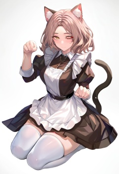 <lora:mln_v1.2-000016:1>, 1girl, short brown hair, yellow eyes, black facial tatto, one eye closed,animal ears, cat ears, tail, cat tail, white thighhighs, paw pose, white background, apron, simple background, sitting, maid, puffy sleeves, looking at viewer, black dress, cat girl, juliet sleeves, white apron, full body, maid apron, seiza, breasts, closed mouth, animal ear fluff, frills, no shoes, medium breasts, collared dress, zettai ryouiki(azuuru:1.1), (torino aqua:1.2), (azuuru:1.1), kedama milk, fuzichoco, ask \(askzy\), chen bin, atdan, hito, mignon,masterpiece, best quality, newest, absurdres, nsfw, explicit