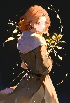 <lora:mln_v1.2-000016:1>, 1girl,brown elbow gloves, one eye closed, black facial tattoo, short brown hair, golden cloak clasp, yellow eyes, grey dress with corset,looking at viewer, holding, looking back, branch around, from behind, holding branch, flower, leaf, holding flower, digital art, golden leaves, geometric shapes, dark background,side profile, glowing, serene expression, headscarf, subtle lighting, elegant, cowboy shot,ciloranko, maccha \(mochancc\), lobelia \(saclia\), migolu, ask \(askzy\), wanke, (jiu ye sang:1.1), (rumoon:0.9), (mizumi zumi:1.1),masterpiece, best quality, newest, absurdres, nsfw, explicit