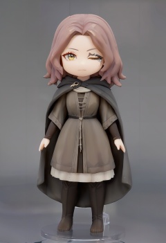 <lora:mln_v1.2-000016:1>, 1girl,pvc figure,golden cloak clasp, brown elbow gloves, hooded cape, one eye closed, black facial tattoo, grey dress with corset, yellow eyes, , brown knee-high boots, short brown hair,chibi, looking at viewer, full body, standing, closed mouth, grey wall, cowboy shot,masterpiece, best quality, newest,nsfw, explicit
