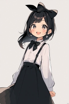 1girl, black_bow, black_skirt, bow, braid, bug, butterfly, earrings, full_body, gloves, hair_bow, hat, jewelry, long_hair, long_sleeves, looking_at_viewer, open_mouth, ribbon, shirt, skirt, smile, solo, standing, suspenders, white_shirt
