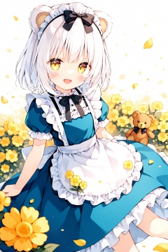 1girl, solo, stuffed toy, teddy bear, dress, stuffed animal, white apron, yellow flower, blue dress, smile, puffy sleeves, animal ears, short sleeves, puffy short sleeves, flower, yellow eyes, petals, frilled apron, apron, looking at viewer, blush, bear ears, frills, bow, white hair, :d, virtual youtuber, white background, maid headdress, black bow