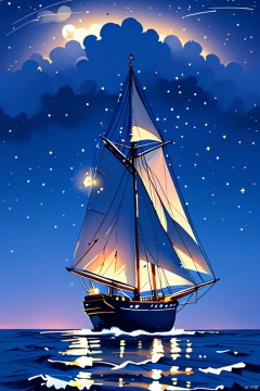 A majestic sailing vessel, its hull adorned with twinkling constellations, sets sail on a starry night sea. The moon casts a gentle glow, illuminating the rippling waves as the ship's lanterns flicker to life, like tiny beacons guiding dreams.,kkla