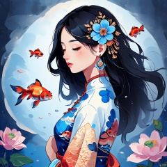 1girl, solo, black_hair, hair_ornament, long_sleeves, jewelry, closed_mouth, closed_eyes, upper_body, flower, earrings, from_side, petals, eyelashes, profile, chinese_clothes, looking_down, animal_print, gem, fish, beads, blue_flower, goldfish, fish_print, koi,kkla