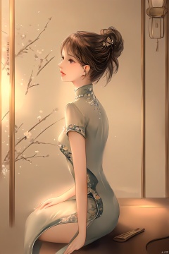 女孩,旗袍,盘发,壁纸,全身,侧身坐,侧光,增加细节,景深(协调人景),室内,暖色光影