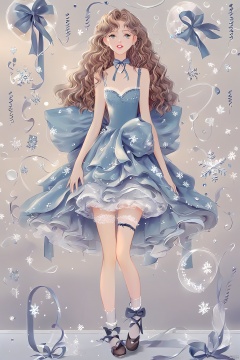 卷发,泡泡裙,不穿袜子,长腿,完美身材,一个女孩,全身,蝴蝶结,雪花,花,增加细节,