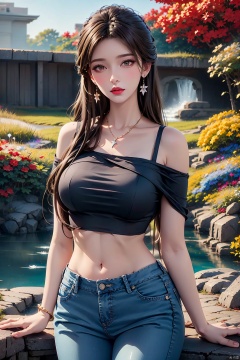 masterpiece, ultra-clear picture quality, real effect, 8k ultra-clear, fine picture effect, ((poakl)),1girl, solo, long hair, breasts, looking at viewer, brown hair, shirt, black hair, navel, bare shoulders, jewelry, medium breasts, standing, collarbone, short sleeves, cowboy shot, earrings, outdoors, parted lips, day, midriff, pants, necklace, off shoulder, tree, lips, crop top, parted bangs, makeup, leaf, plant, denim, building, red shirt, pink shirt, jeans, stairs, realistic, arms at sides, off-shoulder shirt, red lips, bush, cropped shirt