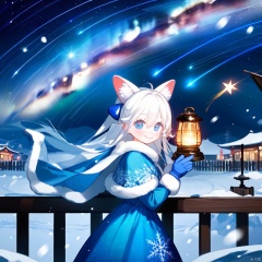 1girl, solo, best quality, starry background, from side, looking at viewer, smile, blush, animal ears, blue eyes, hair between eyes, long hair, white hair, ponytail, bangs, blue gloves, blue dress, long sleeves, fur-trimmed sleeves, snowing, outdoors, lantern, blue bow, railing, blue capelet, hand up, night sky, star \(sky\), shooting star, milky way, starry sky print, space, aurora, light particles, constellation, galaxy, city lights, fireworks, winter, christmas lights, lamppost, fireflies, mittens, planet, star \(symbol\), telescope, snowflakes