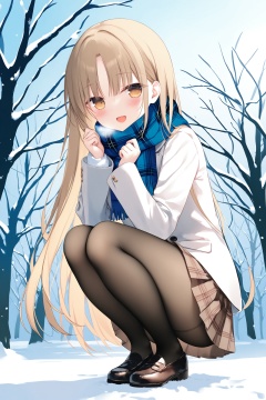 masterpiece,best quality,high quality,(colorful),[Artist toosaka asagi],[[[Artist wlop]]],[Artist chen bin],[Artist omone hokoma agm],Artist hiten (hitenkei),loli,nai3 Style,1girl, solo, pantyhose, long hair, skirt, plaid, scarf, outdoors, squatting, brown eyes, blush, blue scarf, tree, plaid skirt, smile, shoes, bare tree, looking at viewer, bangs, long sleeves, black pantyhose, snow, open mouth, brown skirt, parted bangs, christmas tree, loafers, brown footwear, pleated skirt, winter, light brown hair, virtual youtuber, very long hair, :d, coat, jacket, black footwear, snowing, white coat, sister cleaire, full body, plaid scarf, brown hair, twitter username, blurry