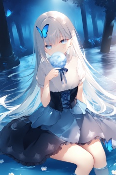 masterpiece,best quality,high quality,(colorful),[Artist toosaka asagi],[[[Artist wlop]]],[Artist chen bin],[Artist omone hokoma agm],Artist hiten (hitenkei),loli,nai3 Style,This is a masterpiece that exudes exceptional quality. The illustration is ultra-detailed, utilizing HDR technology to create a sense of depth. The subject matter is an original, delicate, and beautiful artwork, vibrant with color and filled with fantastical elements. The girl is sitting by a deep sea, surrounded by flowing water, with a dull blue World Tree in the background, situated in a cemetery. The serene and dreamy atmosphere gives the entire scene a soulful and enchanting quality. Her pale complexion, azure blue eyes that glow, and silver hair adorned with flowers create a captivating portrait. She wears a Lolita-inspired fashion, expressionless with her mouth closed. The backgrounds range from white, transparent, circular options, and there are also flying translucent blue butterflies that add a sense of liveliness to the piece.
