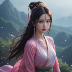 1girl,中国古装女子在山顶眺望,妩媚动人,长发飘散,极其复杂的饰品,多彩民族服饰,艺术人像摄影,奇幻风格,水珠滑落脸颊,自然光,下雨,丁达尔效应