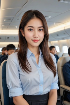 1girl, long hair, looking at viewer, smile, brown hair, shirt, black hair, long sleeves, closed mouth, jacket, white shirt, upper body, ponytail, multiple boys, solo focus, collared shirt, indoors, blurry, uniform, black eyes, lips, blurry background, formal, suit, blue jacket, ground vehicle, realistic