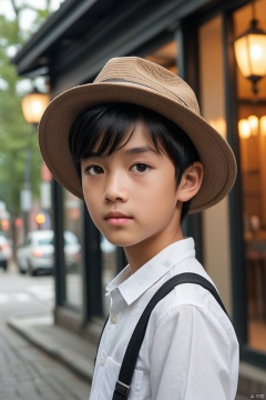 solo, looking at viewer, short hair, shirt, black hair, 1boy, hat, closed mouth, white shirt, upper body, male focus, outdoors, day, blurry, blurry background, sunglasses, realistic