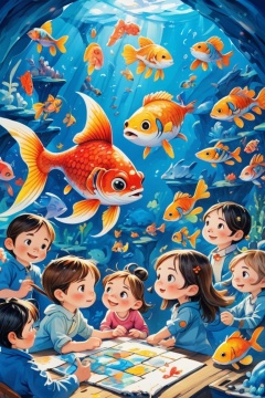 Children book cover, masterpiece, mid shot, highly detailed, concept art, oil painting, gouache, hard brush, An engaging scene featuring a group of diverse kids, deep sea full of Koi fishes, working together to solve a puzzle in an underwater city, Include a mix of charming moments of cooperation, problem-solving, and discovery, while showcasing the rich and imaginative environment of the city, award winning, gibli inspired, kidz, pastelmix