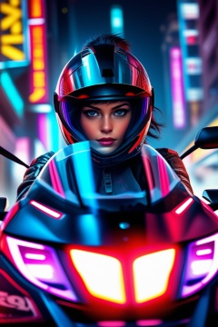 Cyberpunk Street Racer Girl: neon-lit streets, glowing vehicle, futuristic helmet, sci-fi, cyber elements, urban race, intense focus, sleek design, high-speed