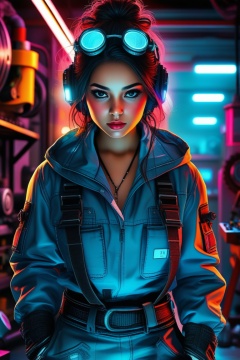 Cyberpunk Mechanic Girl: glowing tools, neon-lit garage, futuristic overalls, sci-fi, cyber elements, urban workshop, digital interface, tech-savvy, rugged appearance