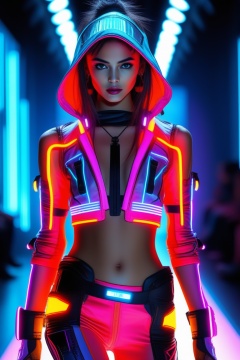 Cyberpunk Fashion Model: neon runway, glowing attire, futuristic accessories, sci-fi, cyber elements, urban fashion show, digital patterns, stylish pose, high-tech chic.
