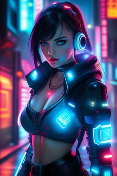 Cyberpunk Cybernetic Girl: glowing implants, neon-lit streets, futuristic attire, sci-fi, cyber elements, digital enhancements, intense expression, high-tech fusion