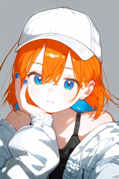 1girl, solo, best quality, aesthetic, white background, simple background, from side, upper body, looking at viewer, hair between eyes, orange eyes, white hair, orange hair, blue hair, short hair, two-tone hair, colored inner hair, bangs, breasts, baseball cap, jacket, white shirt, long sleeves, off shoulder, bare shoulders, orange nails, nail polish, blue nails, fingernails, multicolored nails, white headwear, hand on own face, spoken heart