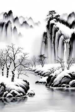 水墨画, 没有人,单色,风景,树,水,户外,雪,岩石,传统媒体,灰度,自然,光秃秃的树,雾,河