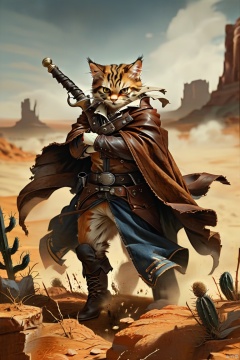 A close-up shot of a feline figure, dressed in a rugged Western-inspired vigilante outfit, complete with a worn leather duster coat, frayed denim shirt, and scuffed boots. The cat's eyes gleam with determination as it grips a worn, ornate sword hilt, the blade slanting across its chest. A dusty, sun-scorched landscape stretches behind, punctuated by cacti and rocky outcroppings.