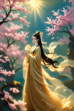 Golden light illuminates a serene forest glade as a stunning Chinese fairy, her long black hair cascading like raven's wings, stands amidst blooming cherry blossoms. Her porcelain skin glows with an ethereal aura, and delicate features are set aglow by the soft sunbeams filtering through the trees. She wears a flowing silk gown in shimmering shades of crimson and gold, its wispy folds billowing behind her like a celestial mist.