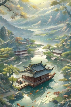 (official art, Masterpieces) , highest quality masterpiece, exquisite description, perfect detail, high definition wallpaper, official art, 16kCG-wallpaper, West Lake scenery, attic, boat, landscape, fish swimming,