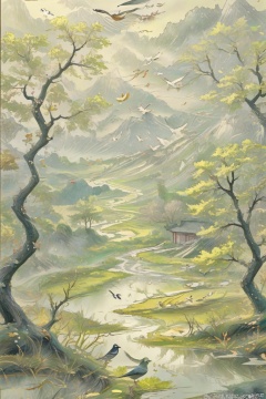 countryside,tree,bird,8k,china, vivid ink painting with chinese style,