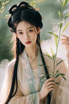 优雅的中国年轻女子,穿着传统服饰,柔焦,柔和的光线,抱着植物茎,乳白色和柔和的颜色,精致的假发,长长的黑发,大而富有表现力的眼睛,宁静的表情,细致的花园背景,梦幻般的氛围,18岁,当代摄影,灵感来自中国古典绘画美学,杰作