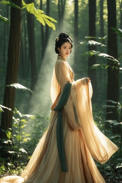 The image captures a scene that seems to be inspired by traditional Chinese attire and settings. The woman in the photograph is dressed in a historical costume that includes a robe with a high collar, known as a 'qipao', and a long, flowing skirt. Her hair is styled in a way that suggests a period hairstyle, possibly from ancient China, with what appears to be a black hairpin or accessory. The background is rich with foliage, predominantly green leaves, which could be interpreted as a representation of a natural, forest-like environment. The lighting is soft and appears to be coming from above, casting gentle shadows and giving the scene an ethereal quality. The overall composition suggests a narrative or thematic focus on historical Chinese culture, with attention to detail in the costume and setting.