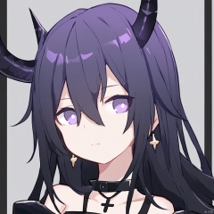 horns,purple eyes,glowing eyes,black hair,long hair,bangs,hair between eyes,demon horns,