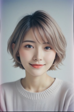 xxmix_girl,portrait of a woman,fluffy short hair,polaroid,film, graininess,smile,cold