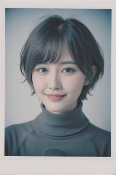 xxmix_girl,portrait of a woman,fluffy short hair,polaroid,film, graininess,smile,cold