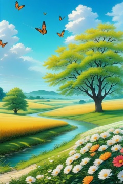 In the beautiful fields of summer, a gentle breeze blows through the big trees on the grassland, and by the roadside are vast wheat fields and streams. Flowers bloom by the stream, butterflies dance gracefully, the blue sky and white clouds shine brightly, and the image quality is high-definition