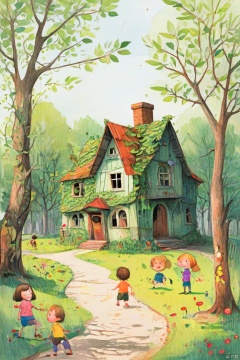 There is only one house, a somewhat dilapidated old one, with green leaves covering the exterior walls and layers of wrapping. The countryside and small roads create a peaceful and lonely atmosphere, with children's hand drawn, pencil drawn, and illustrated images. The colors are bright and the content is rich and colorful, with increased details and clarity, resulting in extremely high resolution