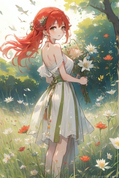 upper body,Create an image of an anime girl with bright red hair,wearing a sundress and holding a bouquet of wildflowers,standing in a field of tall grass with a soft breeze blowing through. The scene should capture the whimsical and carefree style of Sakimichan,with a sense of peace and tranquility in the air.,