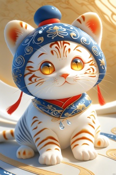 小猫咪,微笑、垂帘帽、虎头虎神、水滴、纯白色、丝绸光泽、小小的、高亮、金黄色眼睛、绒毛、细腻、光滑、柔顺、敦煌艺术风格的插图,呆萌、可爱,笔触极其细腻,柔软光滑,中国红和靛,金色背景,令人难以忘怀的抽象风格的空灵肖像,清晰的背景,C4D , OC渲染风格,柔和的自然照明, 简约优雅的空间, 特写, 高细节,杰作,非具象性,富有想象力,细节丰富
